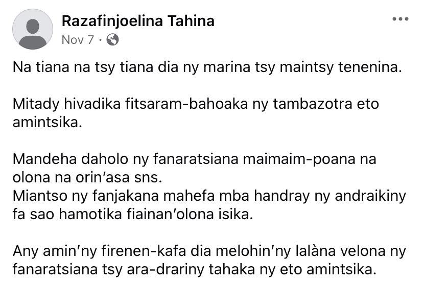Ce n’est pas parce que l’on pointe du doigt les méfaits de mpanasoketa sur Fb que l’on va de ce pas applaudir la verrue orange et sa clique. On peut être du côté des vahoaka mijaly avec Siva contribuer à faire tomber Naivo kely, Rinah et autres Rasempotra puis remettre en cause certaines pratiques de lynchage sur les medias sociaux