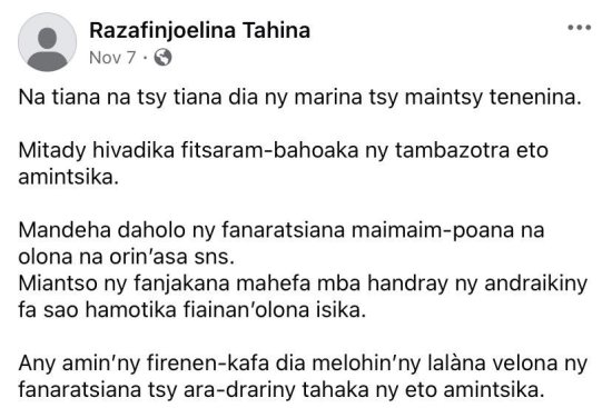 On ne peut qu’approuver la décision salutaire et courageuse prise par Tahiana « Jay Tax » Rasolojaona de porter plainte contre « l’influenceuse » Syntia, qui l’avait accusé de cacher Naina Andriantsitohaina chez lui. Courageuse, car devant les outrances croissantes de certains internautes, beaucoup choisissent de se taire par peur d’envenimer les choses. Salutaire, car il est temps que les balises soient rappelées à ceux qui confondent liberté d’expression et droit de dire n’importe quoi. Saluons dans la foulée le coup de gueule de Tahina Razafinjoelina sur Facebook contre les dérives actuelles sur les réseaux sociaux (photo).