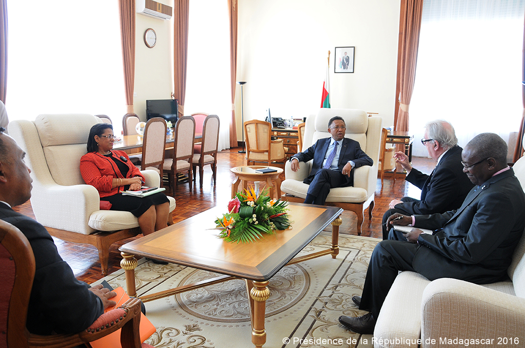 Le chef de l’Etat, Hery Rajaonarimampianina a reçu ce 20 janvier 2015, de hautes personnalités de l’OIF, l’Ambassadeur Malik Sarr et Jacques Bilodeau, Représentant personnel de Michaelle Jean, Secrétaire Général de l’OIF, en présence d’autres personnalités de l’OIF, entre autres, de Philippe Beaulne, Représentant Personnel du Premier Ministre Canadien, du Burkina Faso, de France, du Québec, et des membres de l’organisation du Sommet de la Francophonie à Madagascar, ainsi que de la ministre malgache des Affaires étrangères.