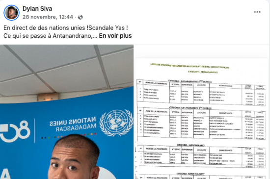 En outre, Dylan Siva a incontestablement de multiples talents dans le domaine de la communication. Celui de lire les situations pour identifier les failles de la mentalité des influençables pour apparaître en héros justicier. Celui d’exploiter des réseaux politiques influents et se faire recevoir à gauche et à droite pour se donner une image de personnalité importante dans le paysage médiatique malgache. Celui de ne pas s’embarrasser de scrupules pour créer la confusion, du style écrire « En direct des Nations unies » dans une publication, pour faire croire aux influençables que sa démarche contre Yas est soutenue par l’ONU (photo). Celui de développer un narratif pour apparaître comme un héros désintéressé, alors que la récente affaire du billet de Ralisy [1] a révélé comment il a essayé d’utiliser une situation pour sa gloriole personnelle sous couvert d’humanisme. Le problème, c’est que les Malgaches connaissent par coeur ce genre de comportement : il y a quelques mois, on appelait cela le werawera, et le champion était sixième dan.