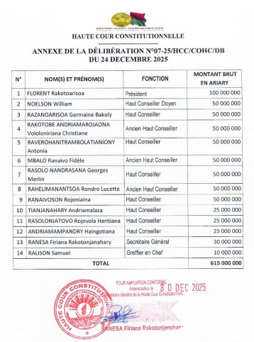L’année 2026 s’ouvre sur la révélation des montants faramineux de prime que les membres de la Haute cour constitutionnelle (HCC) se sont accordés. Dans un contexte de difficultés pour les finances publiques, les membres de la HCC se sont octroyé les largesses suivantes : 100 millions MGA pour le Président, 50 millions pour les Hauts conseillers en fonction ou qui viennent d'être remplacés, 25 millions MGA pour les Hauts conseillers qui viennent d’être installés depuis un peu plus d'une (…)